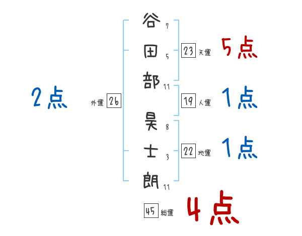 天運![]() | 谷田部昊士朗さんの天運は23画の5つ星!想像力に優れ活力がある。一代で成功し名誉を手に入れる。 家系が持つ宿命的な運勢を表します。祖先から受け継いだ苗字ですので自分の力が及びません。家柄を象徴します。 |