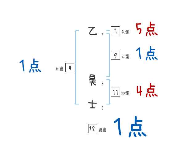 天運![]() | 乙昊士さんの天運は1画の5つ星!行動力、指導力があり出世し繁栄する。幸運に恵まれる。 家系が持つ宿命的な運勢を表します。祖先から受け継いだ苗字ですので自分の力が及びません。家柄を象徴します。 |