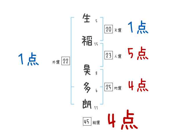 外運![]() | 生稲昊多朗さんの外運は22画の1つ星!努力することが苦手ないっぽう手先が器用。芸術性にも優れる。 生活面を象徴する運勢です。外部から受ける影響力を表し、結婚運、家庭運や職場、環境への順応性を表します。 |