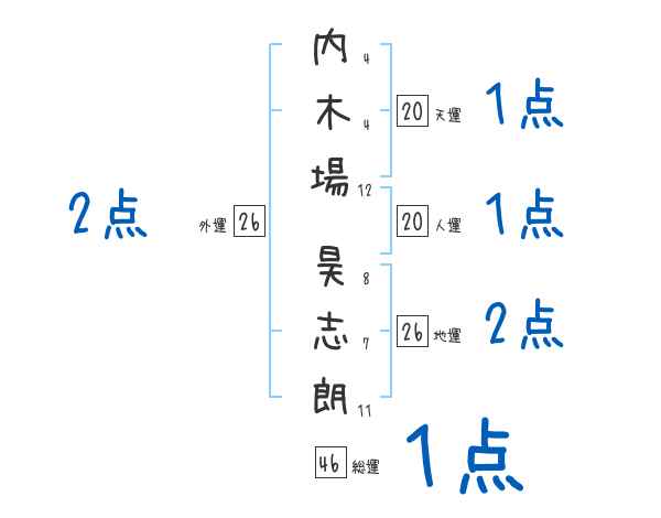 外運![]() | 内木場昊志朗さんの外運は26画の2つ星!波瀾万丈かも。信頼できる人を大事にしましょう。 生活面を象徴する運勢です。外部から受ける影響力を表し、結婚運、家庭運や職場、環境への順応性を表します。 |