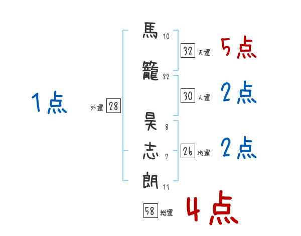 天運![]() | 馬籠昊志朗さんの天運は32画の5つ星!柔軟性があり成功する。チャンスが多く金運が良い。 家系が持つ宿命的な運勢を表します。祖先から受け継いだ苗字ですので自分の力が及びません。家柄を象徴します。 |