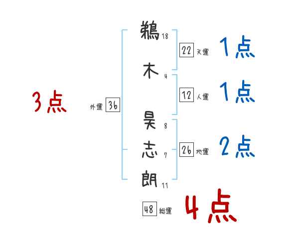 天運![]() | 鵜木昊志朗さんの天運は22画の1つ星!努力することが苦手ないっぽう手先が器用。芸術性にも優れる。 家系が持つ宿命的な運勢を表します。祖先から受け継いだ苗字ですので自分の力が及びません。家柄を象徴します。 |