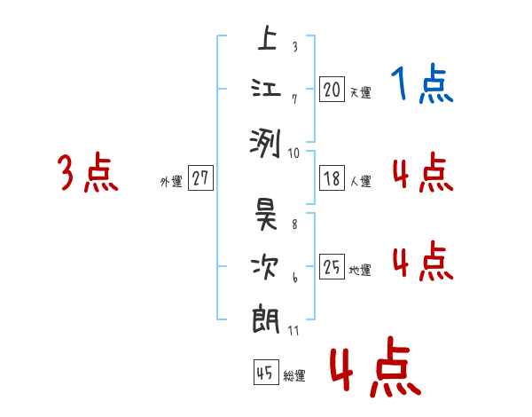 人運![]() | 上江洌昊次朗さんの人運は18画の4つ星!情熱的で剛気。忍耐力があり信頼される。 性格や才能などを表す2番目に重要な運勢です。人間関係や協調性、社会的な成功に影響します。主に20歳から50歳ぐらいまでの中年期の運勢を表します。 |