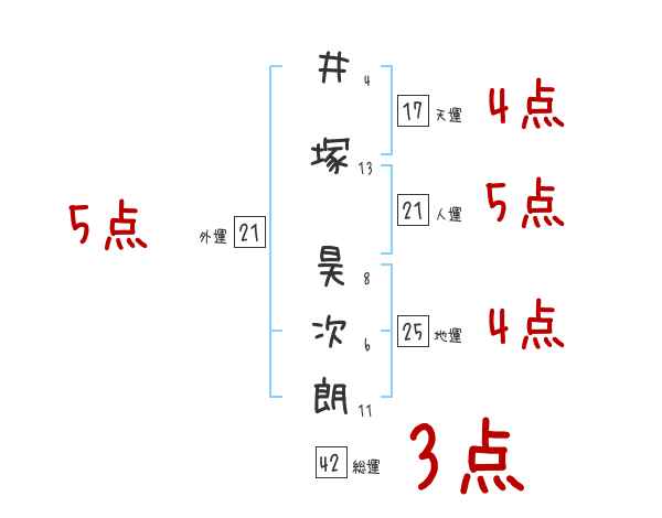 人運![]() | 井塚昊次朗さんの人運は21画の5つ星!統率力がある。独立し成功する。名誉を手に入れる。 性格や才能などを表す2番目に重要な運勢です。人間関係や協調性、社会的な成功に影響します。主に20歳から50歳ぐらいまでの中年期の運勢を表します。 |