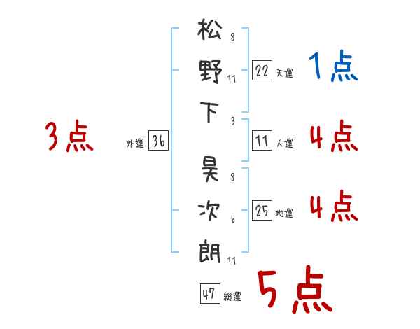 外運![]() | 松野下昊次朗さんの外運は36画の3つ星!先見性が豊かです。多少神経質で苦労することも。 生活面を象徴する運勢です。外部から受ける影響力を表し、結婚運、家庭運や職場、環境への順応性を表します。 |
