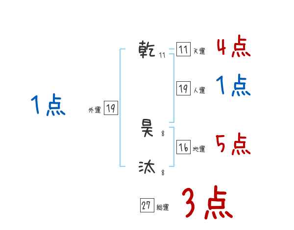 外運![]() | 乾昊汰さんの外運は19画の1つ星!優れた才能を持ちますが、協調性が足りないことも。周りの人と協力する事を意識しましょう。 生活面を象徴する運勢です。外部から受ける影響力を表し、結婚運、家庭運や職場、環境への順応性を表します。 |