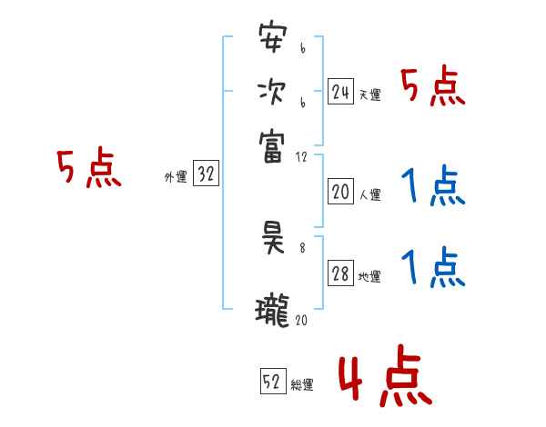 外運![]() | 安次富昊瓏さんの外運は32画の5つ星!柔軟性があり成功する。チャンスが多く金運が良い。 生活面を象徴する運勢です。外部から受ける影響力を表し、結婚運、家庭運や職場、環境への順応性を表します。 |