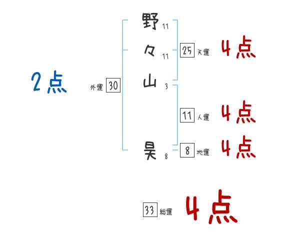 天運![]() | 野々山昊さんの天運は25画の4つ星!個性があり才能があふれる。強運の持ち主で発展する。 家系が持つ宿命的な運勢を表します。祖先から受け継いだ苗字ですので自分の力が及びません。家柄を象徴します。 |