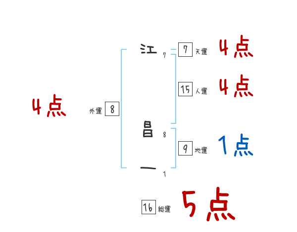 天運![]() | 江昌一さんの天運は7画の4つ星!強い意志や信念を持ち独立心が強い。自立する。 家系が持つ宿命的な運勢を表します。祖先から受け継いだ苗字ですので自分の力が及びません。家柄を象徴します。 |