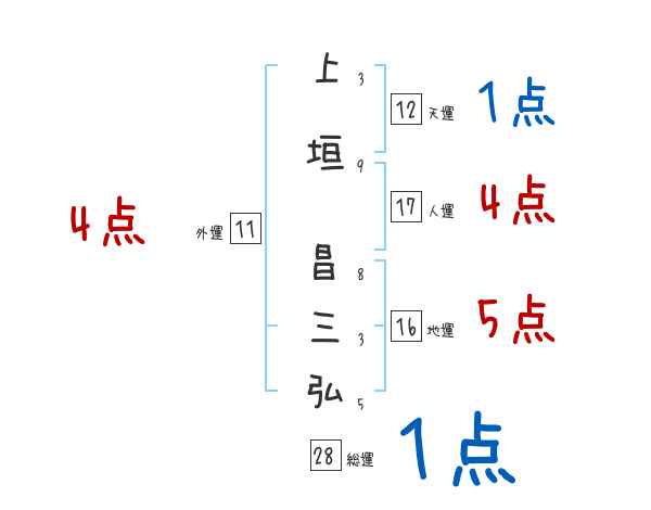 総運![]() | 上垣昌三弘さんの総運は28画の1つ星!家庭環境に注意。スポーツで活躍できる能力があるかも。 あなたの人生を表す1番重要な運勢です。生涯を通じて影響する総合運となり、主に50歳以降の晩年期に影響を及ぼします。 |