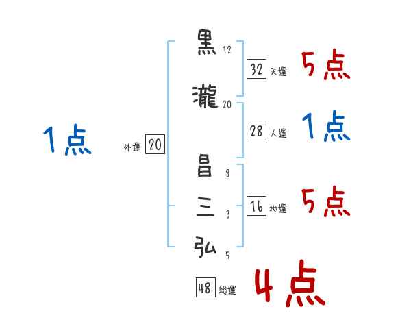 天運![]() | 黒瀧昌三弘さんの天運は32画の5つ星!柔軟性があり成功する。チャンスが多く金運が良い。 家系が持つ宿命的な運勢を表します。祖先から受け継いだ苗字ですので自分の力が及びません。家柄を象徴します。 |