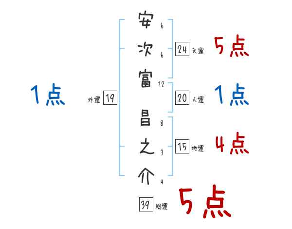 総運![]() | 安次富昌之介さんの総運は39画の5つ星!社交性に優れ人望が厚い。人の上に立ち成功する。 あなたの人生を表す1番重要な運勢です。生涯を通じて影響する総合運となり、主に50歳以降の晩年期に影響を及ぼします。 |