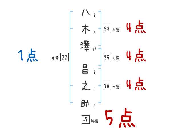 総運![]() | 八木澤昌之助さんの総運は47画の5つ星!実力が開花し発展する円満な人生。財に恵まれる。 あなたの人生を表す1番重要な運勢です。生涯を通じて影響する総合運となり、主に50歳以降の晩年期に影響を及ぼします。 |