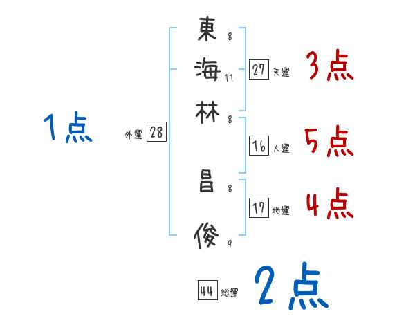 総運![]() | 東海林昌俊さんの総運は44画の2つ星!誠実で慎重な性格。物事を考えすぎないように注意しましょう。 あなたの人生を表す1番重要な運勢です。生涯を通じて影響する総合運となり、主に50歳以降の晩年期に影響を及ぼします。 |