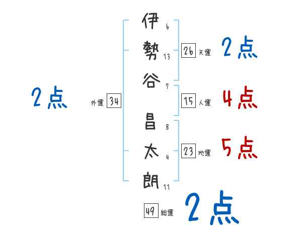 天運![]() | 伊勢谷昌太朗さんの天運は26画の2つ星!波瀾万丈かも。信頼できる人を大事にしましょう。 家系が持つ宿命的な運勢を表します。祖先から受け継いだ苗字ですので自分の力が及びません。家柄を象徴します。 |