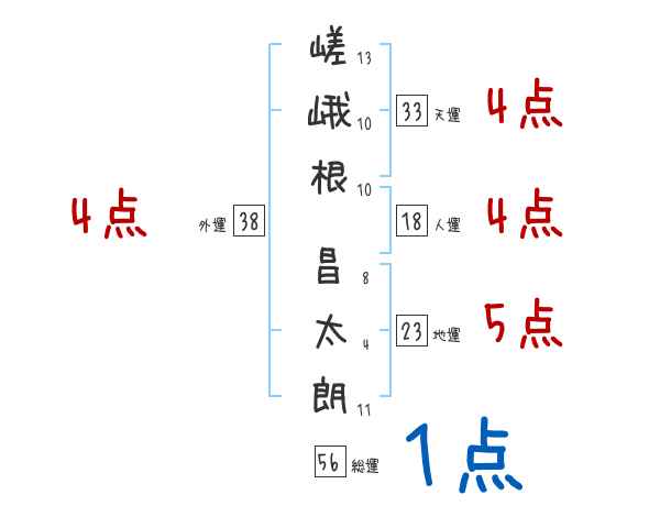 天運![]() | 嵯峨根昌太朗さんの天運は33画の4つ星!権力志向でプライドが高い。勇気があり運を切り開き成功する。 家系が持つ宿命的な運勢を表します。祖先から受け継いだ苗字ですので自分の力が及びません。家柄を象徴します。 |