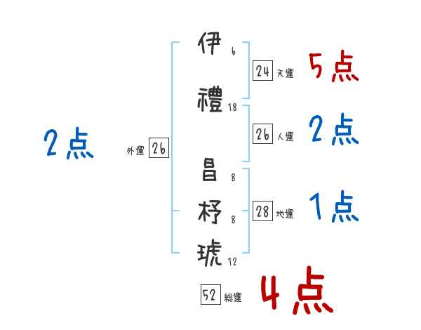 天運![]() | 伊禮昌杼琥さんの天運は24画の5つ星!家庭運が良く順調な人生。金運にも恵まれる。 家系が持つ宿命的な運勢を表します。祖先から受け継いだ苗字ですので自分の力が及びません。家柄を象徴します。 |