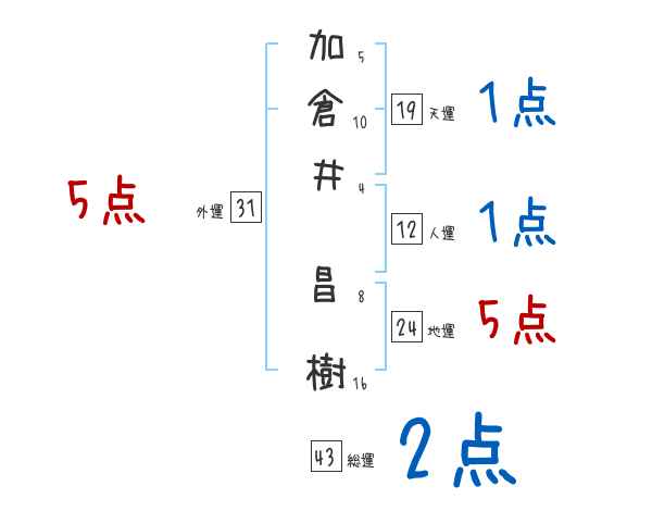 総運![]() | 加倉井昌樹さんの総運は43画の2つ星!頑固な性格で独立心が強いかも。やや非現実的で浪費に注意しましょう。 あなたの人生を表す1番重要な運勢です。生涯を通じて影響する総合運となり、主に50歳以降の晩年期に影響を及ぼします。 |