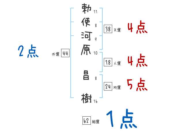 外運![]() | 勅使河原昌樹さんの外運は44画の2つ星!誠実で慎重な性格。物事を考えすぎないように注意しましょう。 生活面を象徴する運勢です。外部から受ける影響力を表し、結婚運、家庭運や職場、環境への順応性を表します。 |