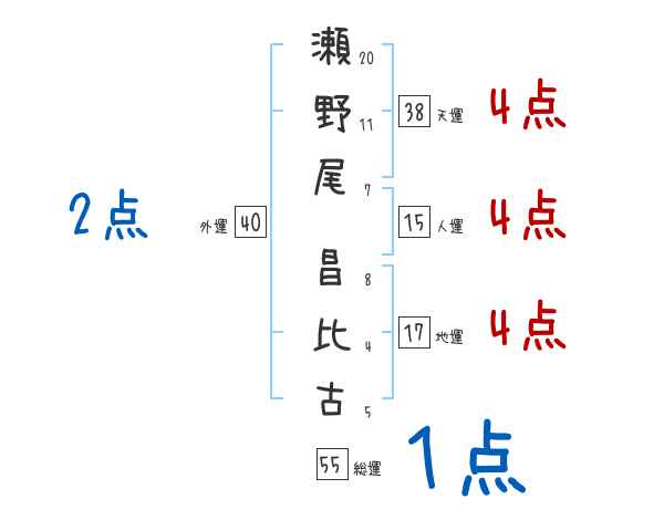総運![]() | 瀬野尾昌比古さんの総運は55画の1つ星!欲張りな性格で軽率な行動に注意しましょう。病気に気をつけて。 あなたの人生を表す1番重要な運勢です。生涯を通じて影響する総合運となり、主に50歳以降の晩年期に影響を及ぼします。 |