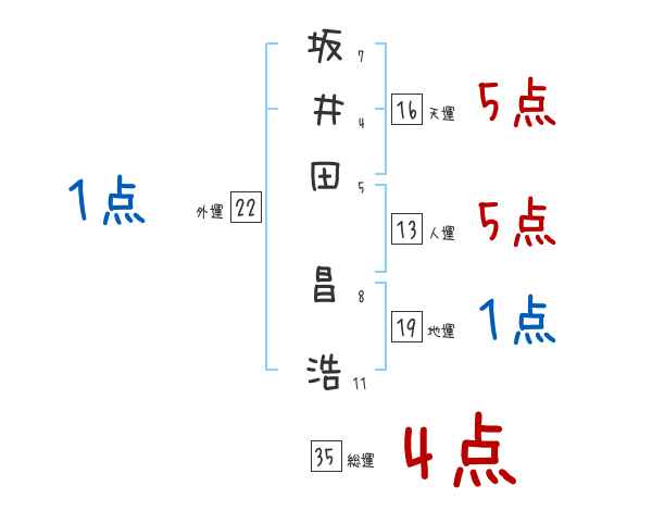天運![]() | 坂井田昌浩さんの天運は16画の5つ星!人望が厚く大きく発展する。逆転成功が見える。 家系が持つ宿命的な運勢を表します。祖先から受け継いだ苗字ですので自分の力が及びません。家柄を象徴します。 |