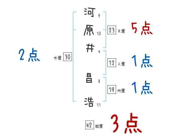 天運![]() | 河原井昌浩さんの天運は23画の5つ星!想像力に優れ活力がある。一代で成功し名誉を手に入れる。 家系が持つ宿命的な運勢を表します。祖先から受け継いだ苗字ですので自分の力が及びません。家柄を象徴します。 |