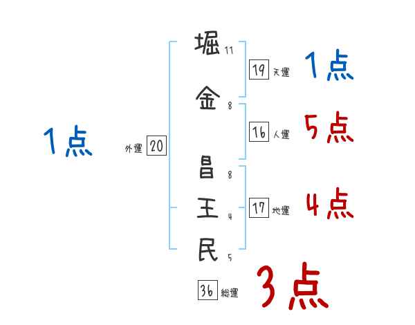 人運![]() | 堀金昌王民さんの人運は16画の5つ星!人望が厚く大きく発展する。逆転成功が見える。 性格や才能などを表す2番目に重要な運勢です。人間関係や協調性、社会的な成功に影響します。主に20歳から50歳ぐらいまでの中年期の運勢を表します。 |