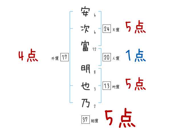 天運![]() | 安次富明也乃さんの天運は24画の5つ星!家庭運が良く順調な人生。金運にも恵まれる。 家系が持つ宿命的な運勢を表します。祖先から受け継いだ苗字ですので自分の力が及びません。家柄を象徴します。 |