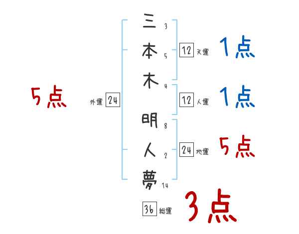 総運![]() | 三本木明人夢さんの総運は36画の3つ星!先見性が豊かです。多少神経質で苦労することも。 あなたの人生を表す1番重要な運勢です。生涯を通じて影響する総合運となり、主に50歳以降の晩年期に影響を及ぼします。 |