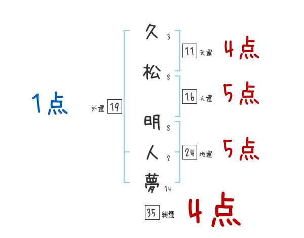 外運![]() | 久松明人夢さんの外運は19画の1つ星!優れた才能を持ちますが、協調性が足りないことも。周りの人と協力する事を意識しましょう。 生活面を象徴する運勢です。外部から受ける影響力を表し、結婚運、家庭運や職場、環境への順応性を表します。 |