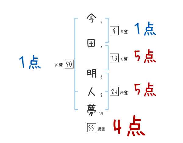 天運![]() | 今田明人夢さんの天運は9画の1つ星!消極的で才能を発揮することが苦手なことも。周りの意見に耳を傾けましょう。 家系が持つ宿命的な運勢を表します。祖先から受け継いだ苗字ですので自分の力が及びません。家柄を象徴します。 |