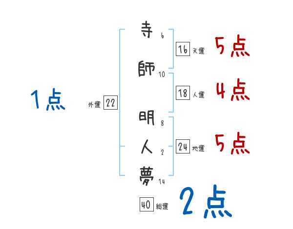 天運![]() | 寺師明人夢さんの天運は16画の5つ星!人望が厚く大きく発展する。逆転成功が見える。 家系が持つ宿命的な運勢を表します。祖先から受け継いだ苗字ですので自分の力が及びません。家柄を象徴します。 |
