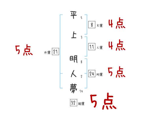 総運![]() | 平上明人夢さんの総運は32画の5つ星!柔軟性があり成功する。チャンスが多く金運が良い。 あなたの人生を表す1番重要な運勢です。生涯を通じて影響する総合運となり、主に50歳以降の晩年期に影響を及ぼします。 |