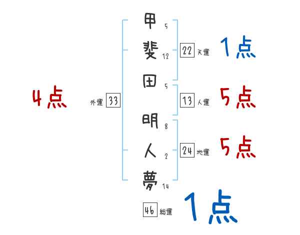 人運![]() | 甲斐田明人夢さんの人運は13画の5つ星!才能に恵まれ人気がある。名声を手に入れる。円満な人生。 性格や才能などを表す2番目に重要な運勢です。人間関係や協調性、社会的な成功に影響します。主に20歳から50歳ぐらいまでの中年期の運勢を表します。 |
