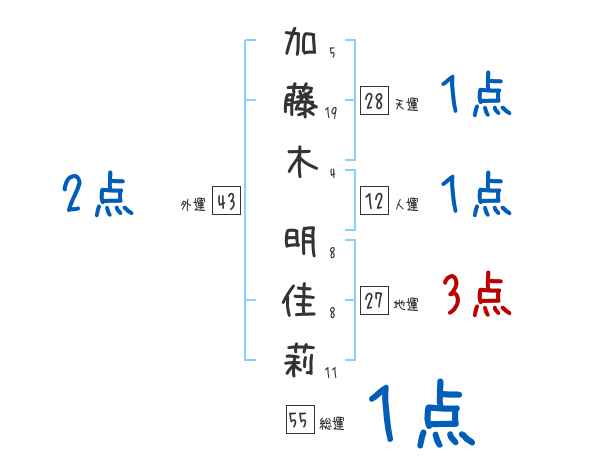 天運![]() | 加藤木明佳莉さんの天運は28画の1つ星!家庭環境に注意。スポーツで活躍できる能力があるかも。 家系が持つ宿命的な運勢を表します。祖先から受け継いだ苗字ですので自分の力が及びません。家柄を象徴します。 |