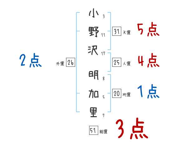 外運![]() | 小野沢明加里さんの外運は26画の2つ星!波瀾万丈かも。信頼できる人を大事にしましょう。 生活面を象徴する運勢です。外部から受ける影響力を表し、結婚運、家庭運や職場、環境への順応性を表します。 |