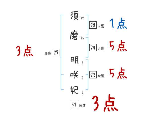 天運![]() | 須磨明咲妃さんの天運は28画の1つ星!家庭環境に注意。スポーツで活躍できる能力があるかも。 家系が持つ宿命的な運勢を表します。祖先から受け継いだ苗字ですので自分の力が及びません。家柄を象徴します。 |