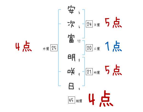 天運![]() | 安次富明咲日さんの天運は24画の5つ星!家庭運が良く順調な人生。金運にも恵まれる。 家系が持つ宿命的な運勢を表します。祖先から受け継いだ苗字ですので自分の力が及びません。家柄を象徴します。 |