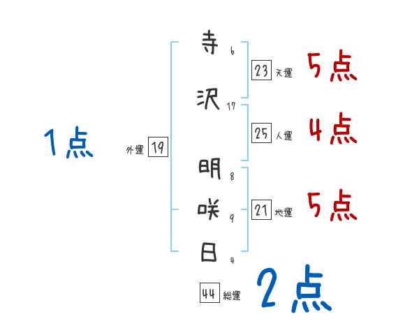 天運![]() | 寺沢明咲日さんの天運は23画の5つ星!想像力に優れ活力がある。一代で成功し名誉を手に入れる。 家系が持つ宿命的な運勢を表します。祖先から受け継いだ苗字ですので自分の力が及びません。家柄を象徴します。 |