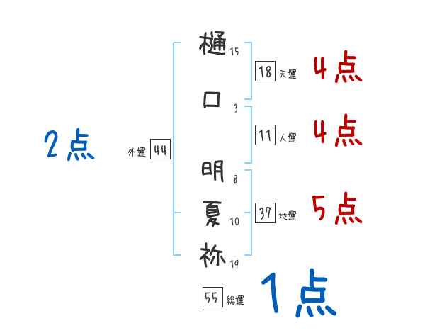 外運![]() | 樋口明夏祢さんの外運は44画の2つ星!誠実で慎重な性格。物事を考えすぎないように注意しましょう。 生活面を象徴する運勢です。外部から受ける影響力を表し、結婚運、家庭運や職場、環境への順応性を表します。 |