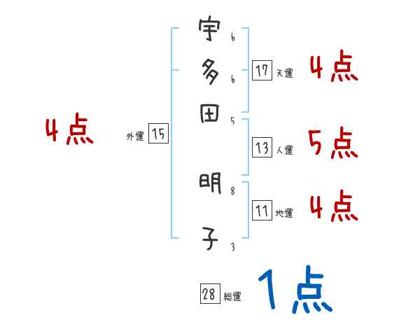 総運![]() | 宇多田明子さんの総運は28画の1つ星!家庭環境に注意。スポーツで活躍できる能力があるかも。 あなたの人生を表す1番重要な運勢です。生涯を通じて影響する総合運となり、主に50歳以降の晩年期に影響を及ぼします。 |