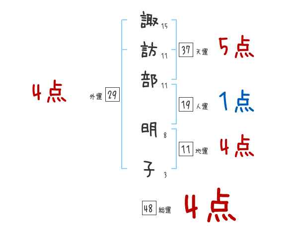 外運![]() | 諏訪部明子さんの外運は29画の4つ星!完全主義で才能がある。厳格な心の持ち主。 生活面を象徴する運勢です。外部から受ける影響力を表し、結婚運、家庭運や職場、環境への順応性を表します。 |