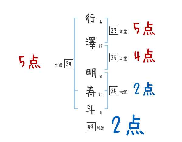 外運![]() | 行澤明寿斗さんの外運は24画の5つ星!家庭運が良く順調な人生。金運にも恵まれる。 生活面を象徴する運勢です。外部から受ける影響力を表し、結婚運、家庭運や職場、環境への順応性を表します。 |