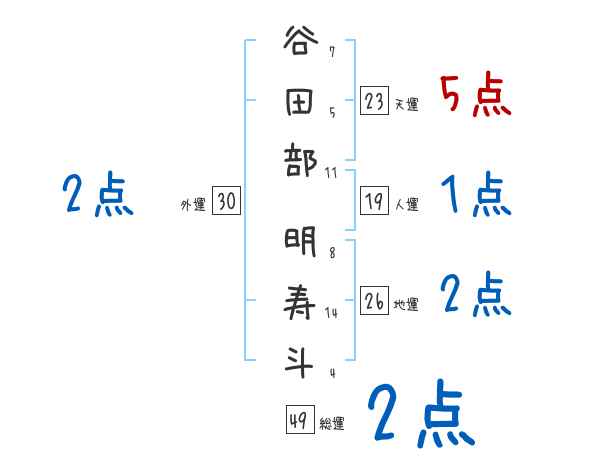 天運![]() | 谷田部明寿斗さんの天運は23画の5つ星!想像力に優れ活力がある。一代で成功し名誉を手に入れる。 家系が持つ宿命的な運勢を表します。祖先から受け継いだ苗字ですので自分の力が及びません。家柄を象徴します。 |