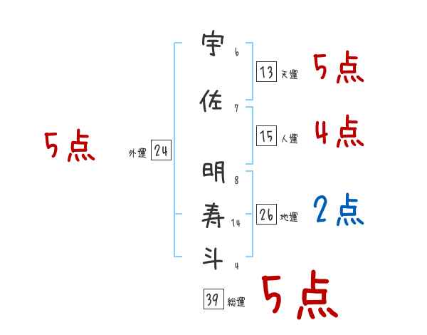 総運![]() | 宇佐明寿斗さんの総運は39画の5つ星!社交性に優れ人望が厚い。人の上に立ち成功する。 あなたの人生を表す1番重要な運勢です。生涯を通じて影響する総合運となり、主に50歳以降の晩年期に影響を及ぼします。 |