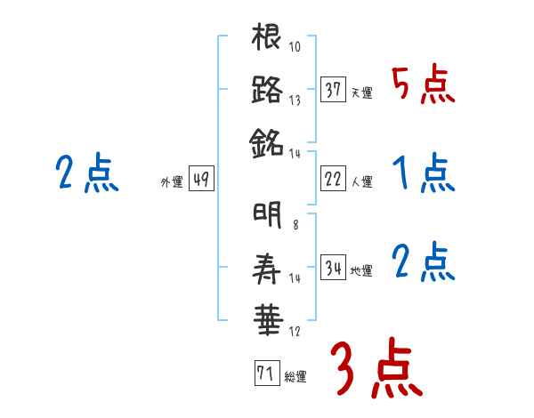 総運![]() | 根路銘明寿華さんの総運は71画の3つ星!力が弱く小心者だが、いずれ安泰を手に入れる。 あなたの人生を表す1番重要な運勢です。生涯を通じて影響する総合運となり、主に50歳以降の晩年期に影響を及ぼします。 |