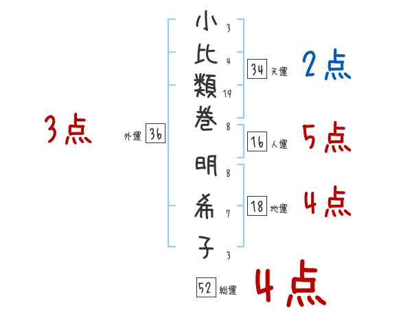 人運![]() | 小比類巻明希子さんの人運は16画の5つ星!人望が厚く大きく発展する。逆転成功が見える。 性格や才能などを表す2番目に重要な運勢です。人間関係や協調性、社会的な成功に影響します。主に20歳から50歳ぐらいまでの中年期の運勢を表します。 |