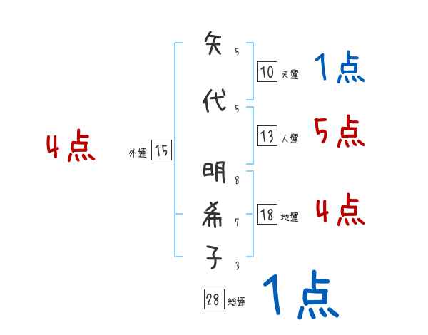 総運![]() | 矢代明希子さんの総運は28画の1つ星!家庭環境に注意。スポーツで活躍できる能力があるかも。 あなたの人生を表す1番重要な運勢です。生涯を通じて影響する総合運となり、主に50歳以降の晩年期に影響を及ぼします。 |