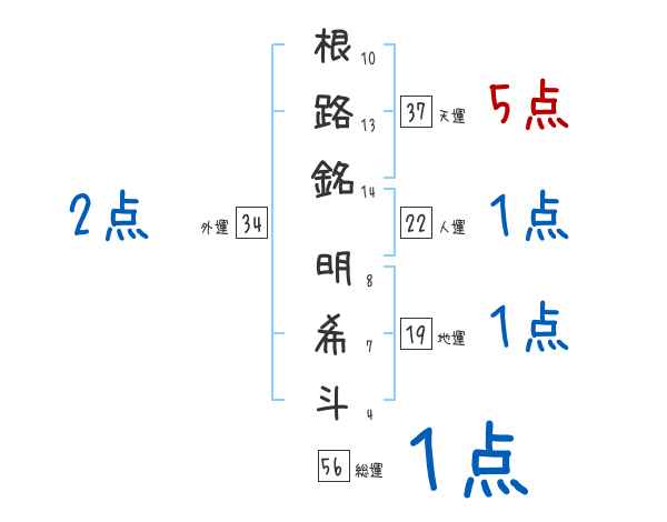 天運![]() | 根路銘明希斗さんの天運は37画の5つ星!努力家で順応性に優れる。現実的な考え方ができ忠実に物事をこなす。 家系が持つ宿命的な運勢を表します。祖先から受け継いだ苗字ですので自分の力が及びません。家柄を象徴します。 |