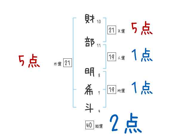 天運![]() | 財部明希斗さんの天運は21画の5つ星!統率力がある。独立し成功する。名誉を手に入れる。 家系が持つ宿命的な運勢を表します。祖先から受け継いだ苗字ですので自分の力が及びません。家柄を象徴します。 |